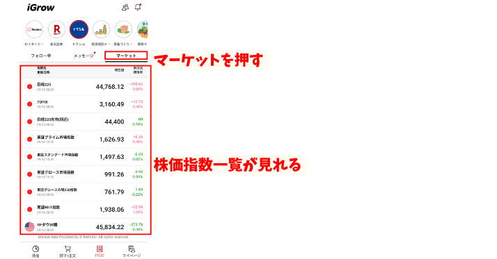 iGrowアプリのFEED画面でマーケットボタンを押すと、国内・海外の株価指数一覧が出てきます。
