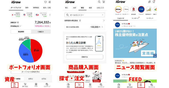 iGrowアプリでは、主に『資産』『探す・注文』『FEED』を使用することが多いですが、どの項目でも分かりやすくて操作に迷うことはほとんどないでしょう。